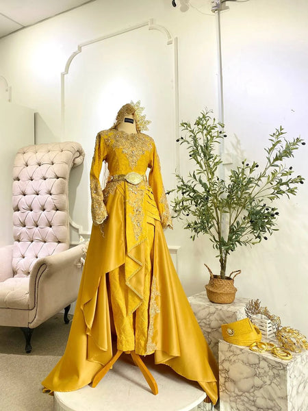 This Puteri Kartika set is ideal for couples who want their Baju Sanding to make a sophisticated yet unconventional statement. The Mustard Gold color is exceptionally flattering for medium to deep skin tones (sawo matang), illuminating the complexion with a warm, celebratory glow.
