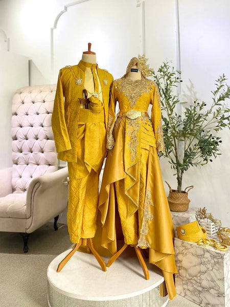 A luxurious Baju Sanding set in rich Mustard Gold Songket 3D, designed for couples who value both elegance and individuality.