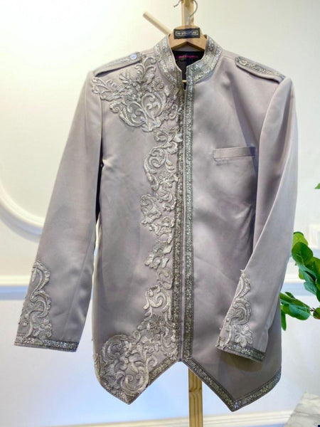 This Grey Prince Suit with Silver Embroidery is the perfect choice for your wedding reception. The elegant grey fabric, enhanced with intricate silver embroidery, creates a timeless, refined look. It’s designed for grooms who want to combine tradition with modern style. Available for rental, this suit ensures comfort and sophistication.