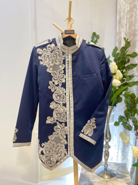 This Navy Silver Prince Suit is designed for your wedding reception. The navy blue fabric paired with silver lace creates a refined, elegant look. It’s the perfect choice if you want to make a bold statement. Available for rental, this suit offers both style and comfort.