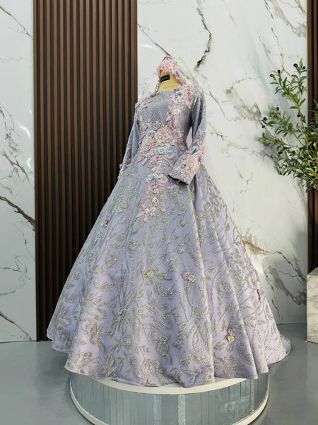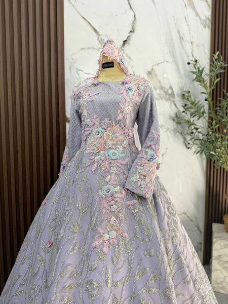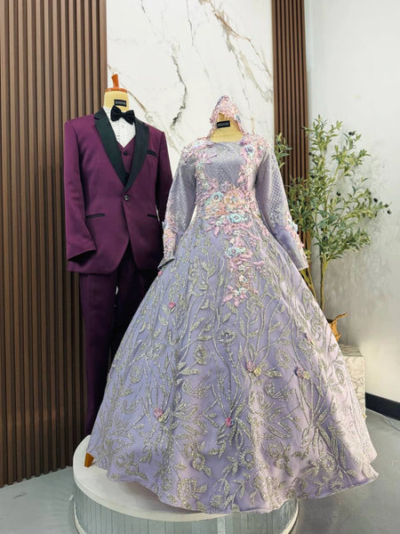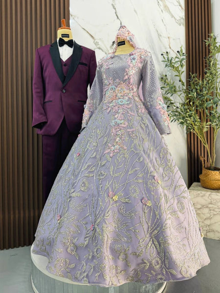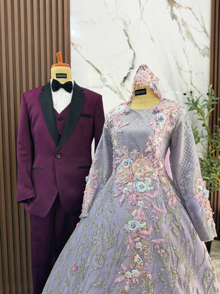 The Purple with Silver palette flatters fair to medium skin tones and photographs exceptionally well under soft, elegant lighting. The ballgown silhouette gives brides a classic princess look, while grooms can personalize their style with 5 outfit options, ranging from a modern tuxedo to a traditional Kot Raihan.