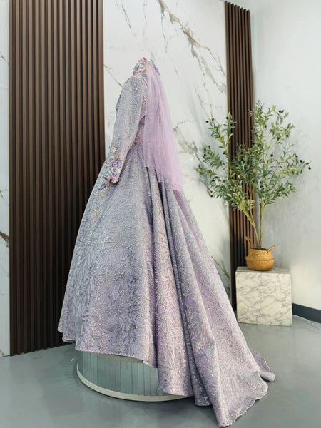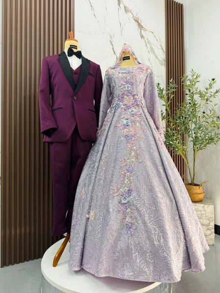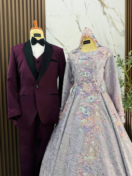 The Purple with Silver palette flatters fair to medium skin tones and photographs beautifully under soft, ambient lighting. The ballgown silhouette gives brides a refined, timeless look, while grooms can personalize their style with 5 outfit options (from modern tuxedo to traditional Kot Raihan).