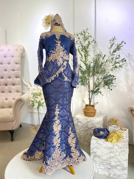 PUTERI BALQIS is a sophisticated Navy Blue with Gold wedding dress crafted with premium Songket 3D fabric.