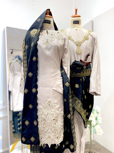 This exquisite ensemble features a light brown champagne Songket Tabur Kurung dress with a black shantung skirt, adorned with a graceful selempang.
