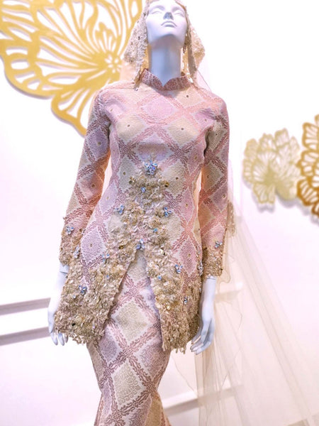The PINKY PIE set is a preloved Baju Sanding ensemble designed for a sophisticated and romantic wedding reception or grand dinner. This unique pairing features a Kebaya Moden for the bride and a Kot Raihan Two-Piece suit for the groom, both crafted from an exclusive Songket 3D fabric.