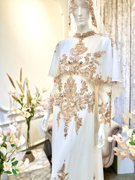• Jubah with detachable cape in Off White with Champagne Lace Chiffon